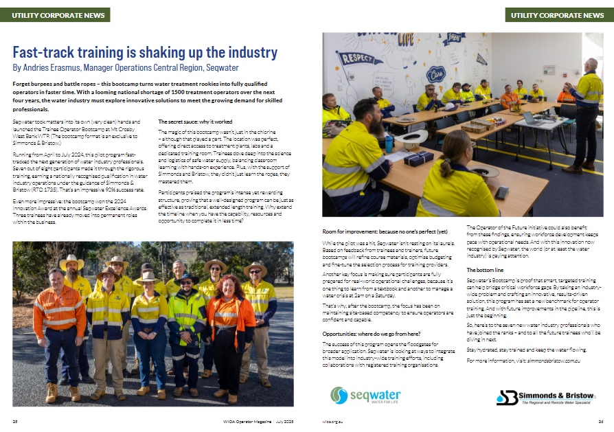 We’re proud to be featured in the latest edition of Operator Magazine by the Water Industry Operations Association of Australia (WIOA), showcasing our collaboration with Seqwater and the success of our fast-track training model – the Training Bootcamp.