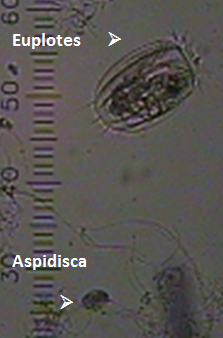 Aspidisca is one of the most commonly observed protozoa in activated sludge populations, and certainly the most common crawling ciliate seen. Aspidisca looks superficially similar to the much larger Euplotes. Aspidisca species range from approx. 25 – 45 µm in diameter, while Euplotes is typically 50-100 µm in diameter.