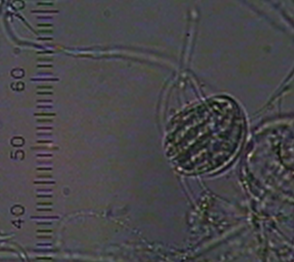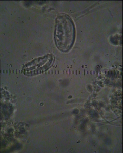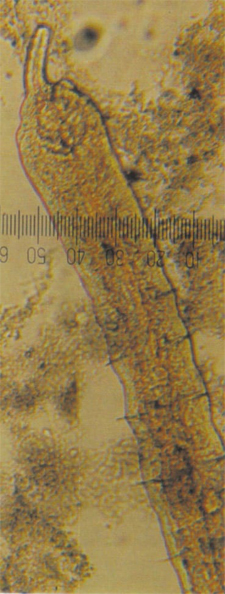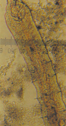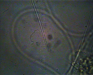 You can see the size comparison in the photo (100 x magnification, 1 scale division = 10 µm) at left.
