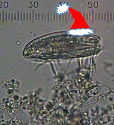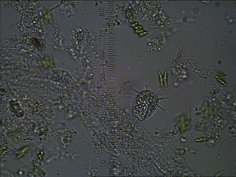 A variety of Aspidisca species may be seen. These can be differentiated by looking at their backs. They range from the smooth backed Aspidisca lynceus; to Aspidisca turrita, who has a single large horn (which looks like a rose thorn) on his back; to the most commonly seen Aspidisca costata, distinguished by the multiple ridges on his back.