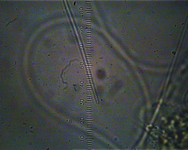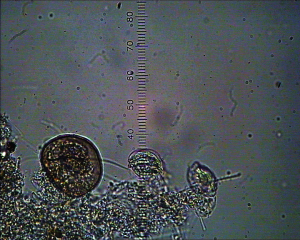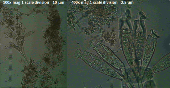 Vorticella reproduce by growing a new daughter head out of the side of the parent head. It starts off looking like a large pimple and develops into a head nearly the size of the original. Once mature, it detaches and swims off in a form we call a telotroch, until it finds somewhere suitable to establish itself and grow its own new stalk. In the picture below at 1000X magnification (1 scale division = 1 µm) you can see the mature telotroch on the left of the parent head, nearly ready to detach and establish independently.