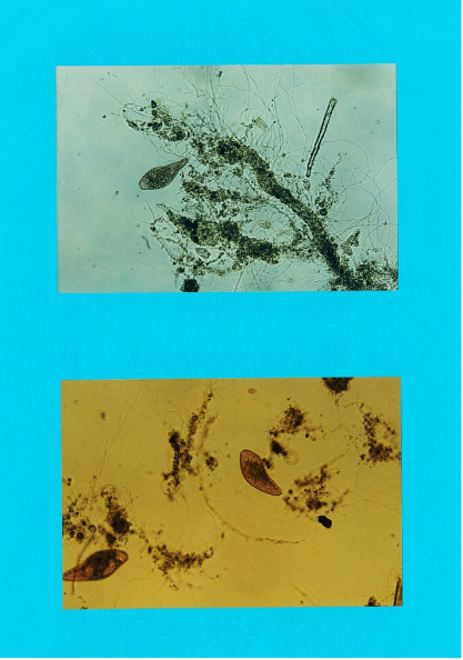 Suctorians Tokophyra (on top) and Podophyra (on the bottom) both at 400X magnification. See the algae (Scenedesmus species) in the photos. The plant was returning supernatant from a lagoon the time.